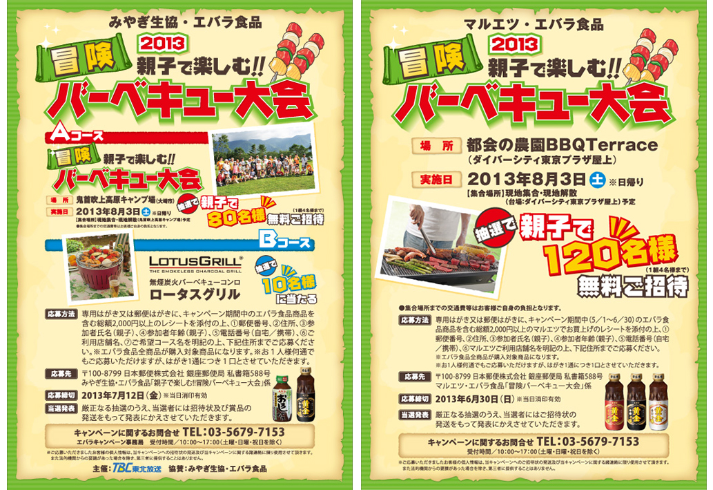 エバラ食品商品を買ってバーベキュー大会や、バーベキューグッズが当たるエバラ食品とチェーンのタイアップキャンペーンです。