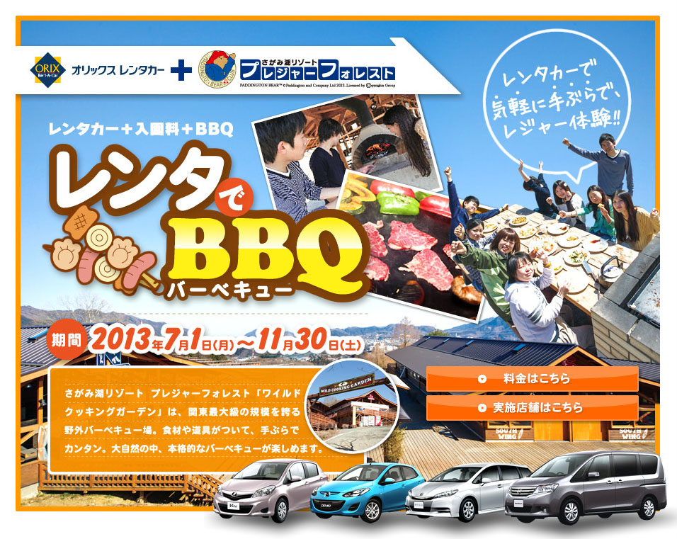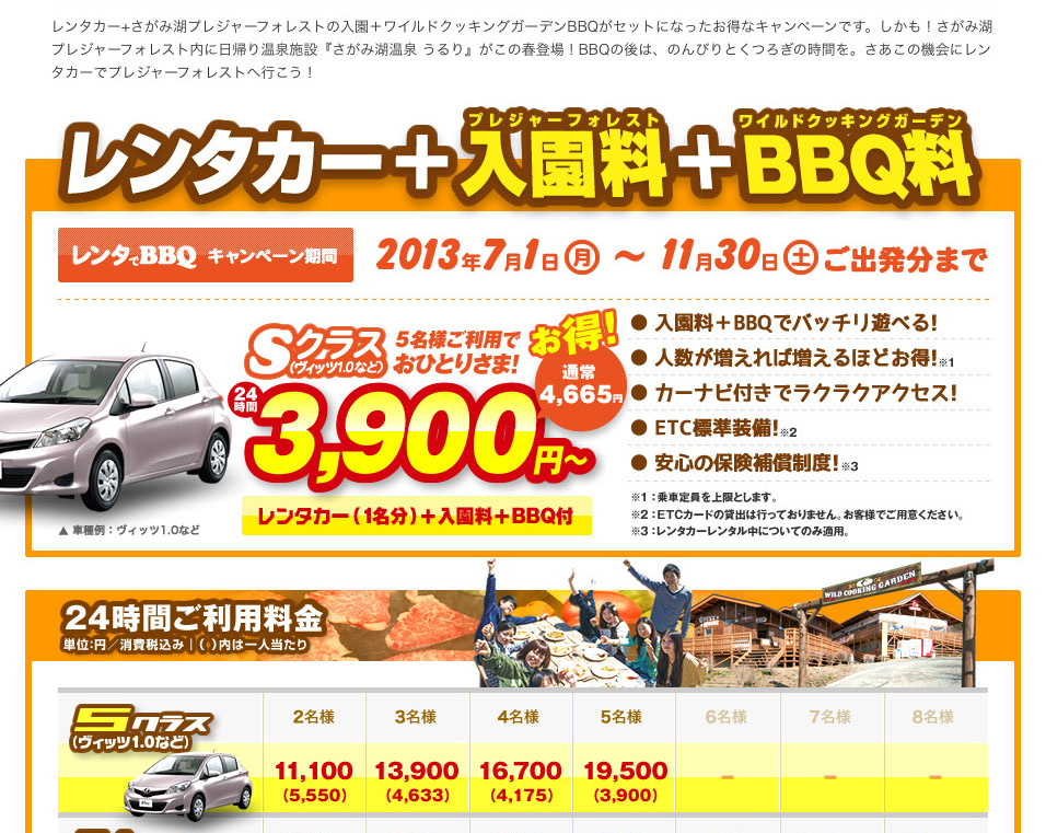 レンタカー+さがみ湖プレジャーフォレストの入園+ワイルドクッキングガーデンBBQをセットにしたパックのキャンペーンです。
