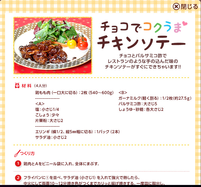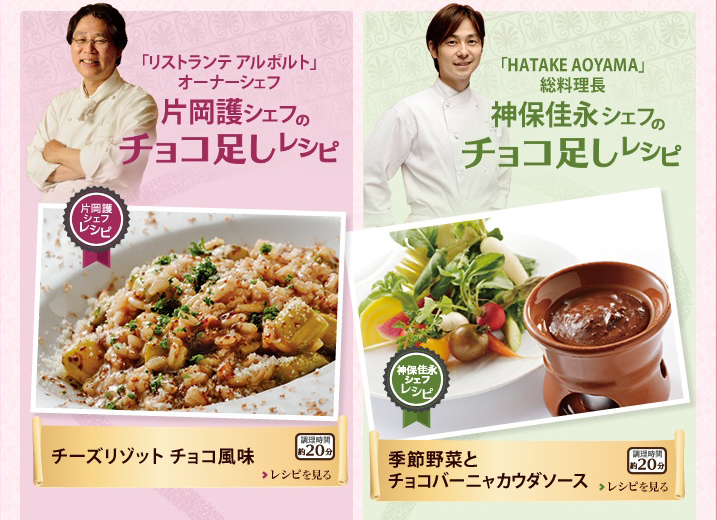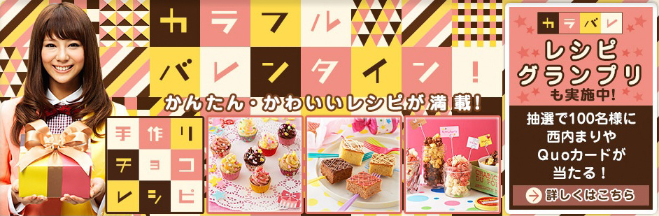 おうち料理研究家のみきママがおうちで食べるチョコごはん&スイーツを提案していたり、甘さひかえめやお酒に合う等の大人のための手づくりレシピなどさまざまなタイプの手づくりレシピを紹介。